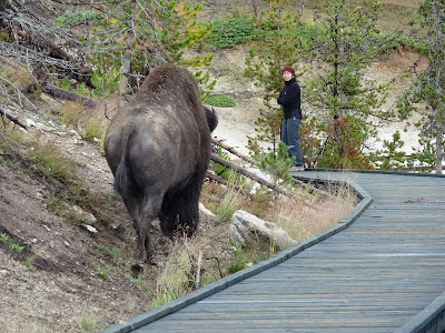 Rencontre sur une passerelle. Ce jeune bison était un peu énervé de ne pas pouvoir approcher les femelles (bisones!!).
