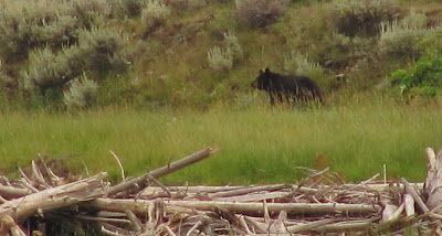 Le seul ours aperçu durant notre séjour. On l'a suivi à la jumelle pendant une dizaine de minutes. Autant dire que c'était l'attroupement sur la route. Il a disparu dérrière un bosquet après avoir traversé une rivière à la nage. Rivière sur laquelle s'étageait une dizaine de pécheurs à la mouche.